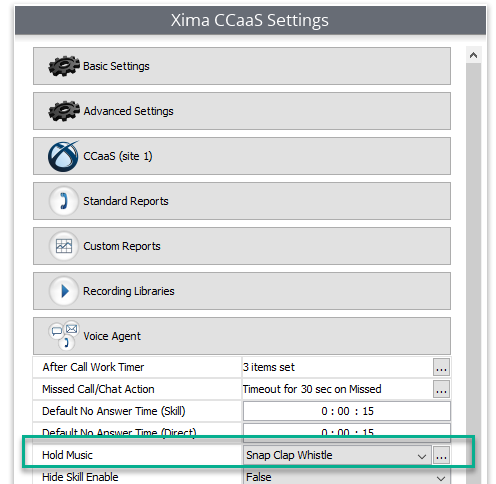 To change the hold music, navigate to the Administrator Client > System Settings > Voice Agent > Hold Music