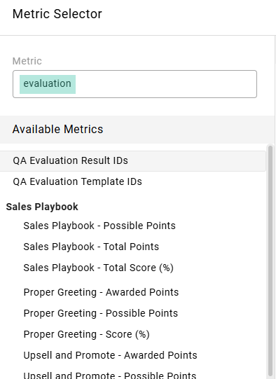 In the supplied "Metric" search box, type "Evaluation" to filter to evaluation-based metrics: