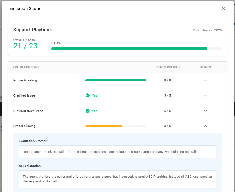 - Evaluation results support user-feedback, allowing a manager to give positive or negative feedback to a provided score. Having continued feedback from a manager will fine tune AI's ability to better match your companies perspective of how calls should be evaluated, but this is not required.
